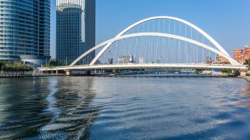 海河外滩公园是滨海新区重要的城市景观建筑,也是市民休闲娱乐的地方。外滩公园上有大、中、小三组结构大悬挑构架“碧海帆影”景观。三个构架像大海中航行的帆船,与蔚蓝的海河水浑然一体,蔚为壮观。