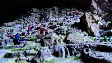 百魔洞位于广西河池市巴马县甲篆乡坡月村西侧,又名百魔天坑,是一个雄伟壮观的石灰岩溶洞。洞内钟乳石、石笋造型千奇百怪,气势恢宏的穿岩、神秘的天坑和缓缓流淌的盘阳河水又为其增添了一丝清秀的气息。穿行在百魔洞中,孔雀迎宾、良田万顷、金山猴王、杜甫吟诗等精巧的钟乳石造型都让人叫绝,而且洞内有洞,洞洞相连,十分奇特。