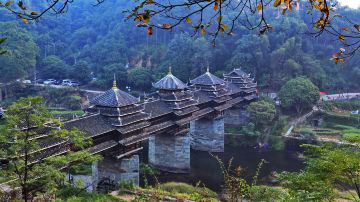程阳风雨桥位于三江侗族自治县内的程阳八寨景区中,桥身无一颗铁钉,全由木质榫卯结构而成,至今依然不倒。桥面铺板,两旁设有栏杆、长凳,就像一条长廊形走道,在桥墩上方更是建有塔亭,行人可在桥上躲避风雨。程阳风雨桥横跨在林溪河上,与周围的青山绿水互相映衬,形成一幅美丽的画卷。