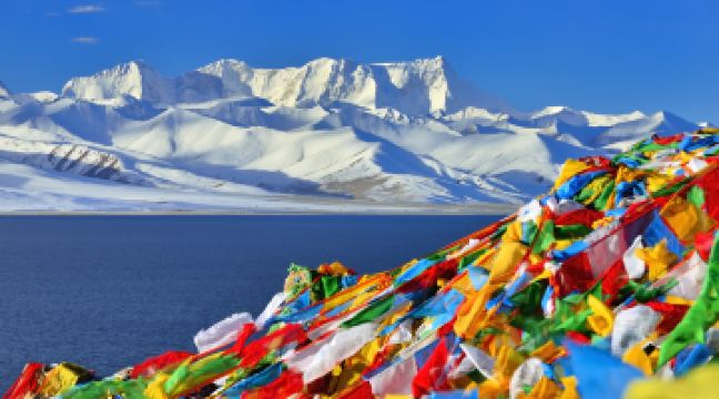 念青唐古拉观景台是观赏念青唐古拉山主峰的理想位置。观景台旁,经幡随风飘动,远处,都是皑皑的白雪和耸立的群山。蓝天,白云,雪山,还有黑的白的牦牛,以及迎风而舞的经幡,这一切构成了一幅斑斓的图画。
