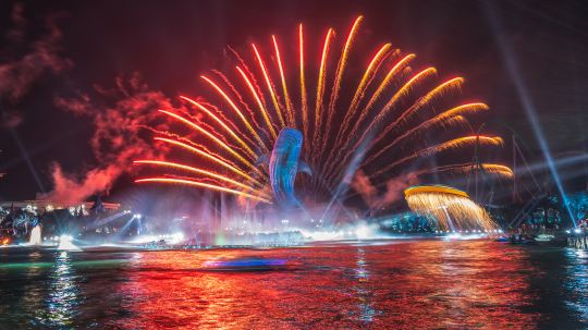 ​海洋保卫战呈现150架无人机演出、大型烟花表演、绚丽的激光与宏大的爆破场景,喷泉汇演、高难度的水上飞人演出,特技摩托艇与“鲸鲨”飞驰,俨然一场好莱坞实景大片,缔造视听冲击力十足的感官享受。