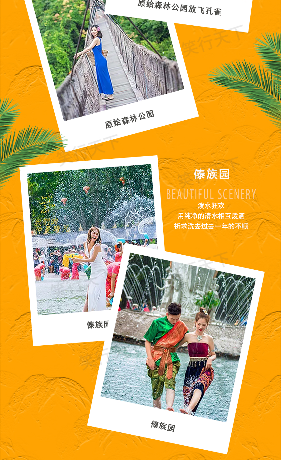 早餐: 酒店早餐 午餐: 当地特色风味餐 晚餐: 品尝傣泰风味大餐,观看具有东南亚浓郁文化
