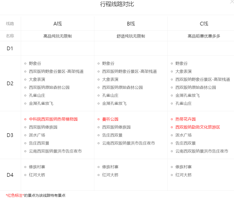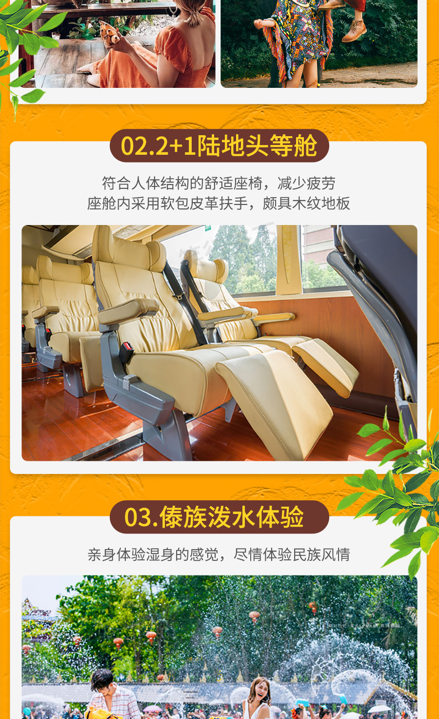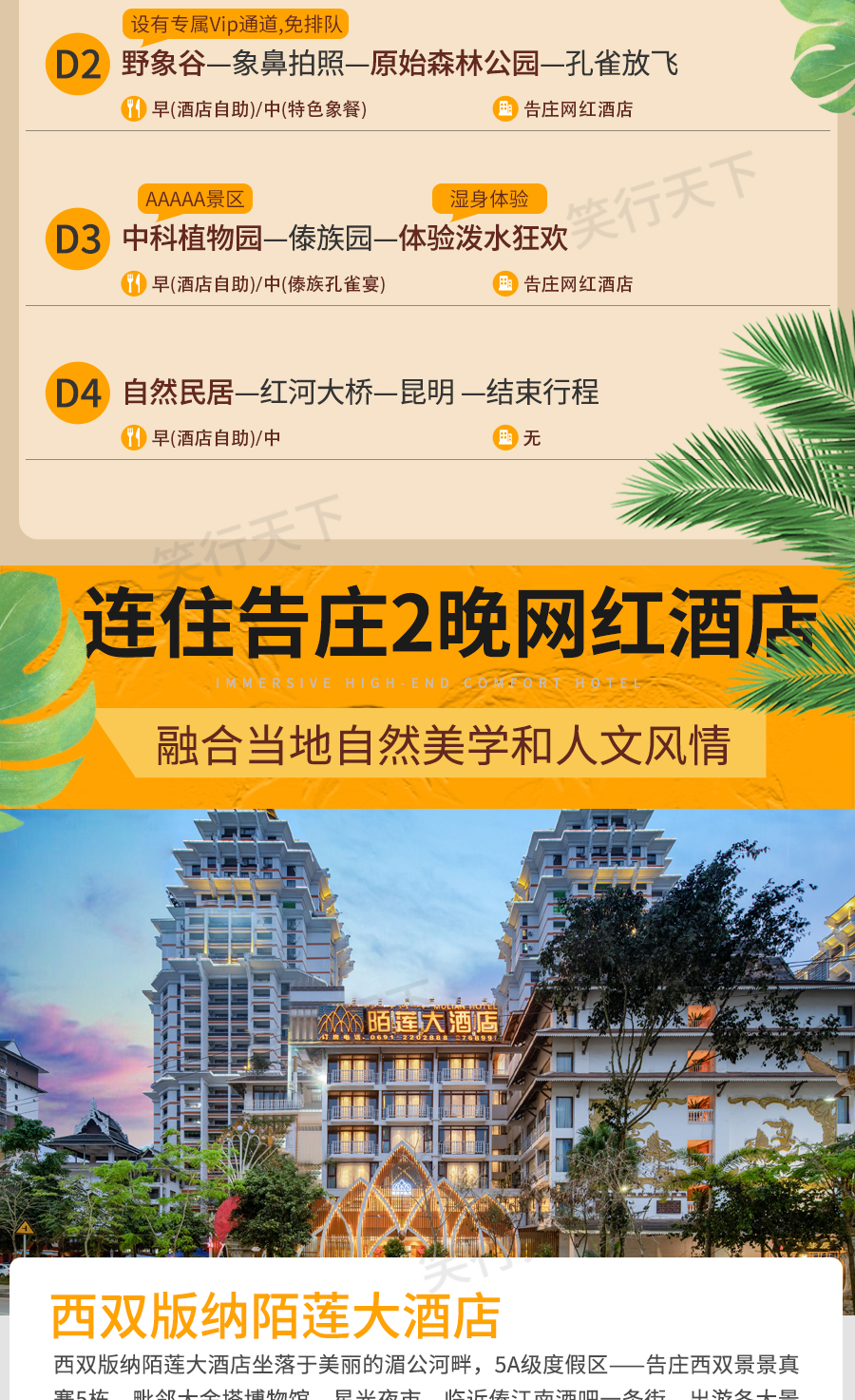 优选行程:全新座架陆地头等舱大巴车,不早起,不晚归,野象谷VIP通道拒绝等候彰显贵族,版纳升级2晚高端告庄网红酒店,住好才能保证玩好;
