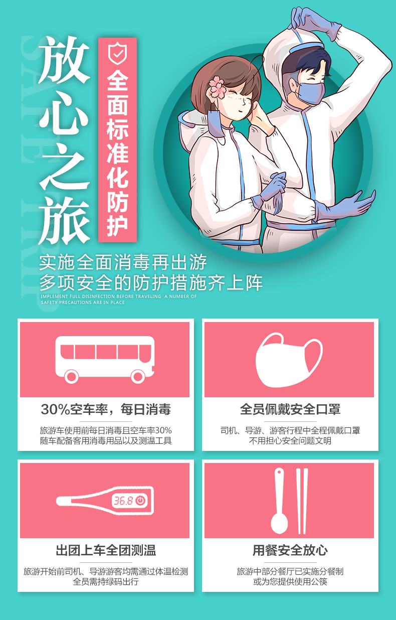 产品说明 为保障您和其他客人的安全,团队车辆使用前每日至少消毒1次;司机、导服、所有团队客人行程开始前需通过体温检测;司机、导服行中全程佩戴口罩;随车配备客用消毒用品及测温工具;行中团餐部分,实现分餐制,或为您提供公筷