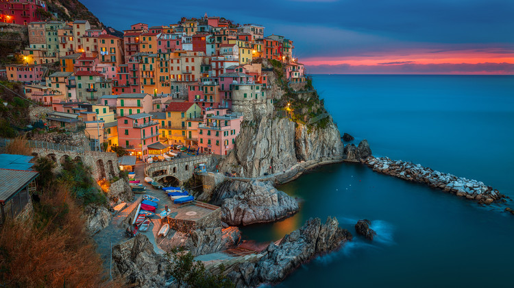 【世外桃源五渔村】*(不少于1.5小时):搭乘当地火车游览五渔村其中富有特色的2个村落,欣赏在悬崖峭壁的绵延海岸线及山谷有许多色彩缤纷的房舍,斜坡上绿意盎然的葡萄园,景色宜人,令人心旷神怡。