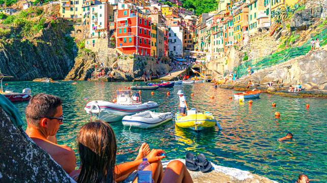 游览五渔村(含火车约1.5小时,不含爱之路),世界文化遗产,由蒙特罗索、威尔纳扎、克里日亚、马纳罗拉、里奥马乔列五个渔村而组成,依著山势而开垦出的房舍与田园,保留原始的自然美,仿佛与世隔绝彷彿世外桃源,而被联合国教科文组织列为世界遗产,更有人形容是北意的阿玛菲。盘据在悬崖上一栋栋色彩缤纷的房舍,及岸边停靠色彩缤纷的船只,斜坡上绿意盎然的葡萄园,景色宜人,令人心旷神怡。(五渔村的第二个村Manarola是非常美丽的,这里是明信片地标村落,也是红遍网络的那个色彩斑斓的悬崖村落。)