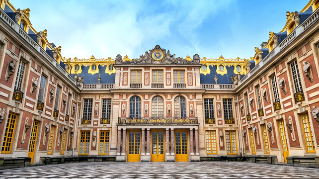 凡尔赛宫外观宏伟,内部陈设更富于艺术魅力,处处金碧辉煌,豪华非凡。