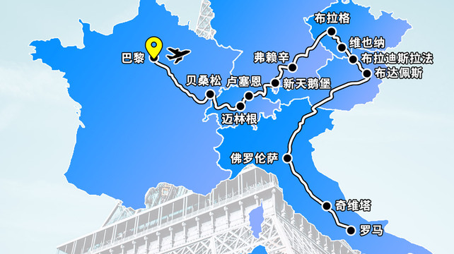 缤纷景点: 法国:卢浮宫&凡尔赛宫(耳机讲解)&塞纳河游船&埃菲尔铁塔&凯旋门 瑞士:冰川3000雪山&琉森&金色山口景观列车 意大利:威尼斯&佛罗伦萨&罗马&比萨斜塔&五渔村&天空之城&斗兽场&贡多拉游船 德国:新天鹅堡-迪士尼原型 匈牙利:布达佩斯 | 奥地利:维也纳 斯洛伐克:布拉迪斯拉发 | 捷克:布拉格 斯洛文尼亚:布莱德城堡 | 克罗地亚:萨格勒布
