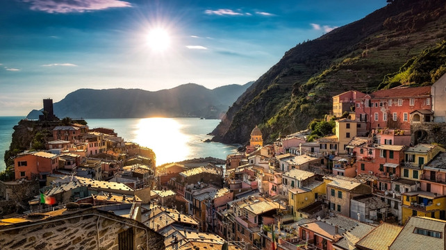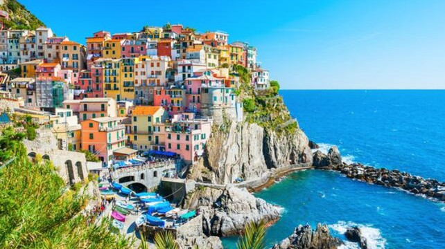 Cinque Terre 又称为“五渔村”,是地中海畔列名于世界文化遗产中的五座美丽渔村。欣赏在悬崖峭壁的绵延海岸线及山谷有许多色彩缤纷的房舍,斜坡上绿意盎然的葡萄园,景色宜人,令人心旷神怡。碧澈的海水和奇巧的险峰让这五个静静躺在利古里亚海边山坳中的小渔村有了如诗如画的醉人之美。沉浸于古老的遗迹与壮观的景致在碧绿大海的衬托下,沿线右边是壮丽陡峭的山崖,左边即是蔚蓝深邃的利古里亚海,远看彷佛十分惊险,就像走在石壁之中,让走在小径上的恋人紧紧地牵起双手,佳人美景更添浓情蜜意。